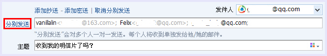 寫信時,選擇了分別發送功能,將會把郵件一一單獨發送給各收件人。每個收件人將收到單獨分送給她/她的郵件。