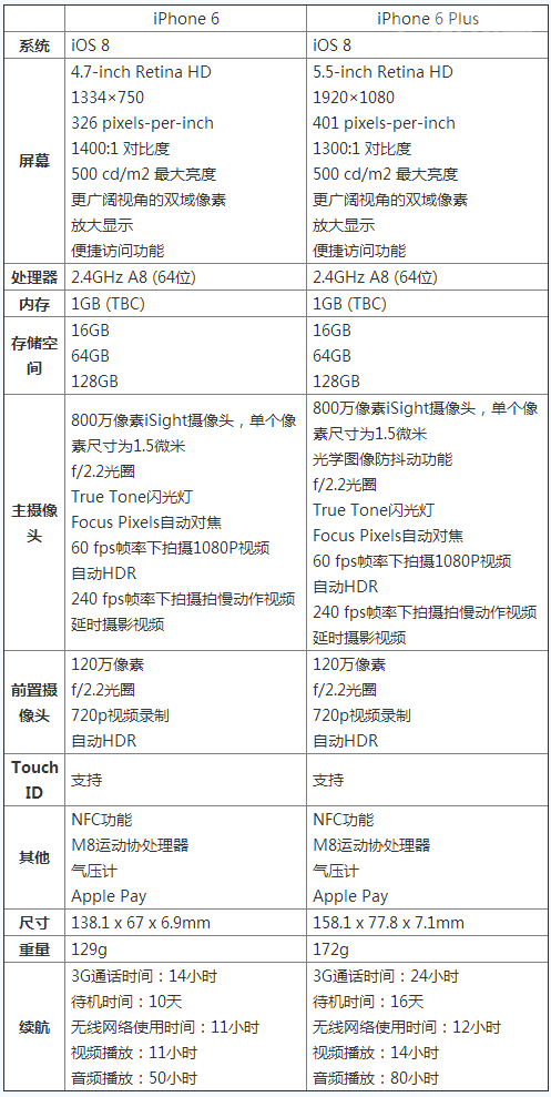 其實兩款iPhone6的整體配置還是差不多的,主要差別在屏幕大小、分辨率、電池容量和機身尺寸等方面的差別。