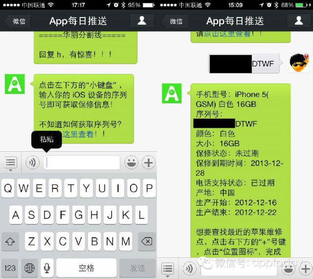 然後在微信上關注App每日推送 的公眾號(微信搜“apptoday”或者是“App每日推送”關注 ),把剛復制的序列號粘貼到輸入框發送便OK,手機型號、保修信息一目了然!