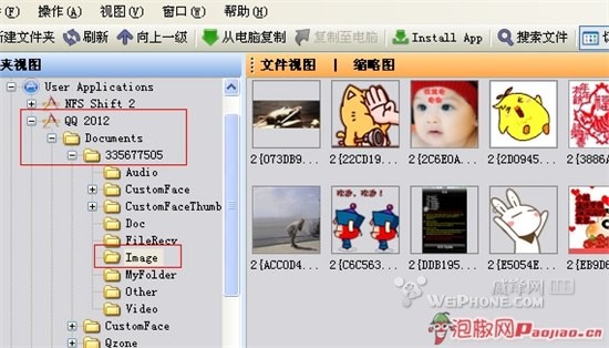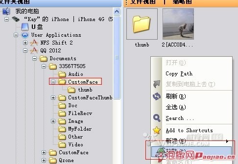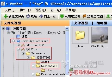 一、 打開iFunbox,依次打開路徑:User Applications/qq2012/Documents/自己的QQ號碼(一串數字)/CustomFace,這個CustomFace就是最新版iPhoneqq2012存放自定義qq表情的地方。