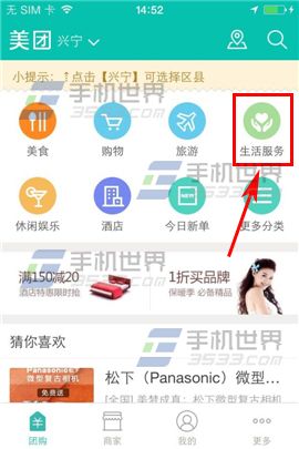 1)下載並打開【美團】,進入界面後點擊右上方的【生活服務】。(如下圖)