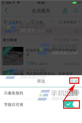 2)界面跳轉後點擊右下角杯狀的按鍵,有【只看免預約】和【節假日可用】兩種選擇,選擇自己喜歡在後面點擊一下,再點擊上面的【完成】就可以啦。(如下圖)