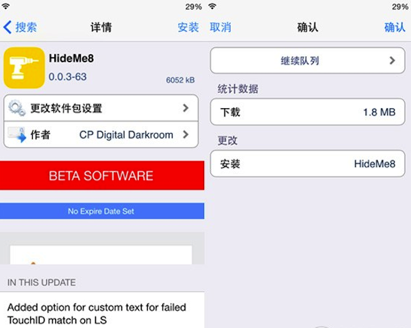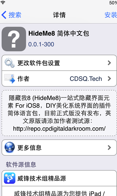 iOS8完美越獄已經出來一段時間了,各種越獄插件也都更新支持iOS8了,深受用戶歡迎的Hideme8插件也在第一時間兼容了,不僅如此,前段時間,經過大神@CDSQ的努力,終於將Hideme8進行了漢化,並公開了Hideme8漢化包。下面小編就教大家如何安裝簡體中文版的Hideme8插件。