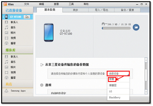 在【從非三星設備傳輸您的備份數據】菜單下,點擊【選擇設備】,並選擇【蘋果】。