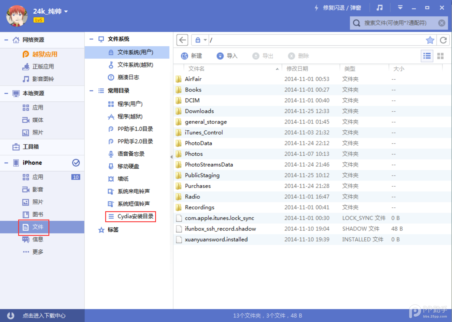一、電腦上安裝最新版本的PP助手,然後打開【文件】-【cydia安裝目錄】: