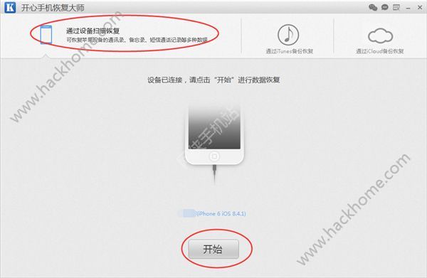第二步:運行開心手機恢復大師,我們今天選擇第一模式,所以直接將手機連接到電腦上即可,當手機連接成功之後,我們就可以點擊界面下方的“開始”按鈕跳轉到下一步恢復操作了;