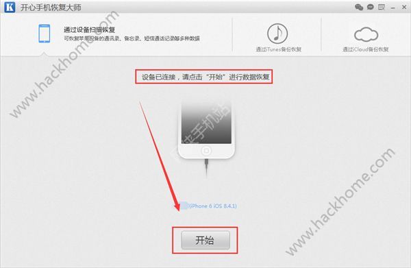 第二步:然後將需要恢復通訊錄的iPhone手機連接到電腦上,首次連接的話需要點擊“信任”按鈕,連接完成後運行軟件,此時開心手機恢復大師界面會出現一個“開始”按鈕,點擊開始進入蘋果iPhone手機電話號碼的恢復操作;