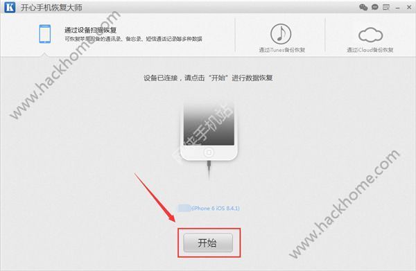 第一步:首先你需要下載最新版的開心手機恢復大師的軟件,然後將你的蘋果手機連接到電腦上,連接成功之後直接打開軟件,然後在軟件的主界面上直接默認第一模式,點擊“開始”進入數據恢復模式;