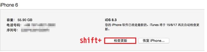 3、然後按住鍵盤上的 Shift(Option),同時鼠標點擊 iTunes 界面的【檢查更新】按鈕,再選擇對應版本的 iOS10 beta1 固件進行升級。
