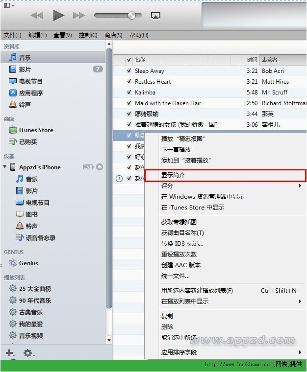 要給歌曲添加歌詞和專輯封面,我們需要打開itunes,在資料庫中找到音樂,下面我們以精忠報國這首歌為例來進行操作,在該首歌曲上單擊右鍵,選擇顯示簡介菜單: