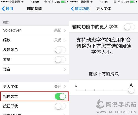 拖動屏幕到下方找到“粗體文本”一項,點一下右方的滑塊指示開啟該功能。系統會提示重新啟動iPhone,點擊“繼續”按鈕。你也可以設置字體的大小,改善你的閱讀。
