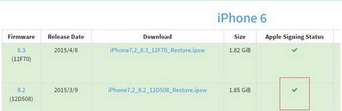 當時iOS8.2一欄顯示綠色的小勾,即代表能降級到iOS8.2