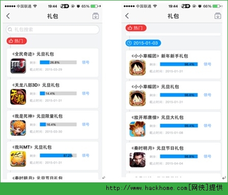 點開“禮包”按鈕,就可以看到游戲禮包列表,列表上還可以直觀地看到禮包截至時間和領取剩余百分比,讓你對這個禮包立刻有初步的了解。