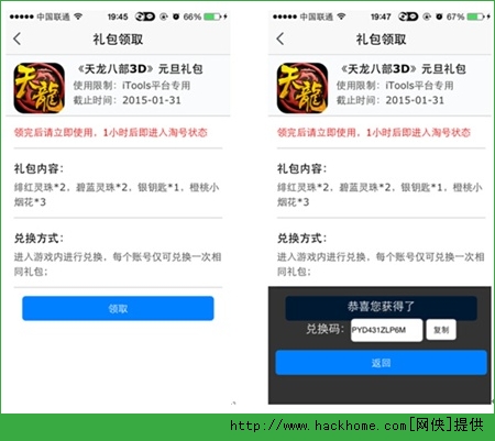 選擇你想要的游戲禮包,直接點擊打開就可以看到禮包的具體內容,直接一鍵“領取”,就可以獲得相應的兌換碼。兔子君在此再次溫馨提示,兌換碼需要在一個小時之內登陸游戲激活禮包,否則兌換碼將重新進入淘號系統。