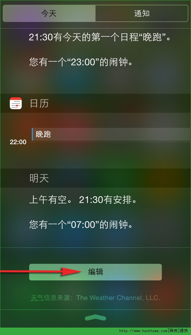 在 iOS 8 通知中心移除小部件第一步:在在通知中心點擊「編輯」按鈕。