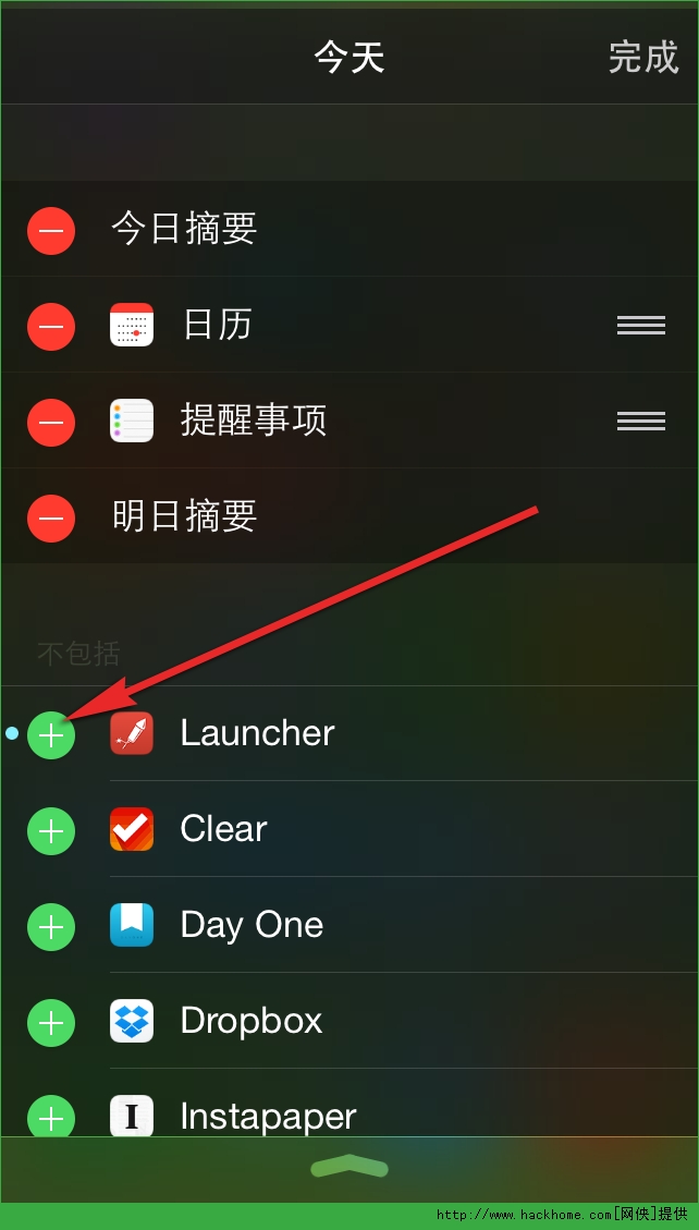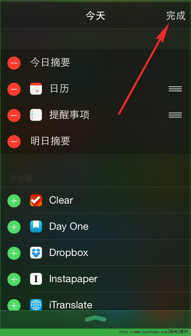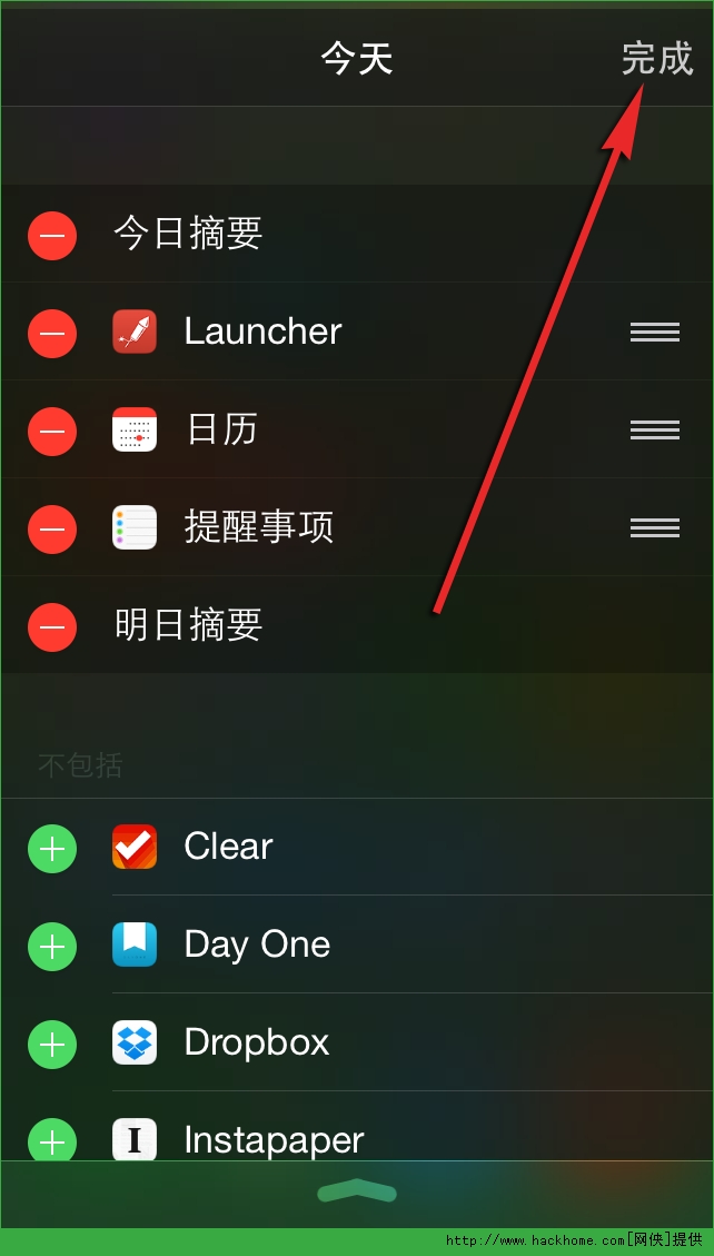 第五步:你還可以拖動小部件來改變它們出現在通知中心的順序,最後按右上角的「完成」按鈕確定添加。