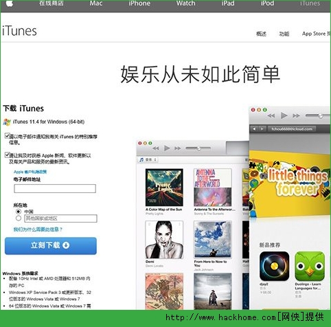 建議使用最新版本的iTunes軟件來進行ios8正式版的刷新,目前官網最新版本為11.4。大家可以直接點擊此處進入蘋果iTunes官方下載頁面,網頁會自動給出32位或者64位版本的iTunes下載,點擊左側藍色的“立刻下載”按鈕即可下載。下載後安裝一下即可。