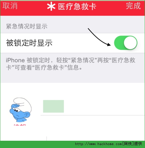隨後系統會自動調用我們的在通訊錄中的名字,如果沒有的話,可以自己選擇。這裡建議打開“在鎖定屏上顯示”選項,這個功能可以在沒有鎖屏密碼的情況下也可以打開醫療急救卡,在後面會說到具體怎麼打開。