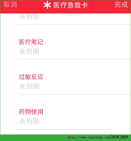 接著你還可以為自己添加醫療筆記,過敏反應,血型,身高等詳細信息,添加完成以後請點擊右上角的“完成”按鈕。