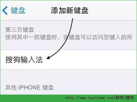 第二步、在“第三方鍵盤”下方,點擊添加“搜狗輸入法”鍵盤。