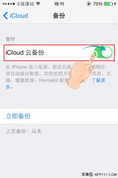 第二步,在iCloud備份選項頁面,點擊開通“iCloud雲備份”功能。點擊“立即備份”,即可開始備份。
