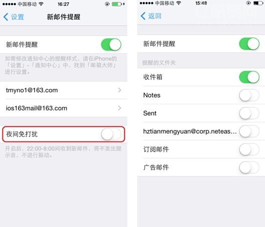 iOS郵箱:不支持,只能統一開啟或關閉提醒 郵箱大師:支持