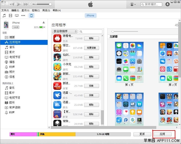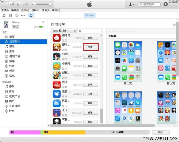 第二步,應用下載完成後,在iPhone管理頁面,應用程序欄目中,點擊剛下載應用的右側的“安裝”按鈕,即可顯示“將要安裝”。然後點擊右下角的“應用”按鈕,開始同步。