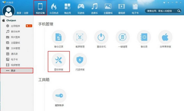 1、將手機連接V5版助手——我的設備——更多——圖標修復