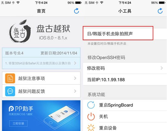打開盤古程序,依次點擊【小工具】-【日/韓版手機去除拍照聲】就是這麼簡單,當然,前提是你需要越獄。點擊http://www.pc6.com/edu/72099.html查看。