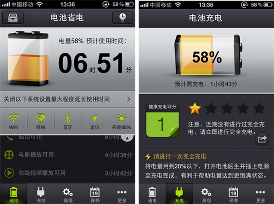 初次使用“金山電池醫生專業版”最大的好處在於操作簡單、快捷,基本上所有設置都是傻瓜式。現階段軟件主要針對手機WiFi、數據、亮度、 GPS、音量等設置調節已達到省電目的,該軟件內置普通、中等、超級三個默認模式,支持用戶自定義一鍵式省電。國慶假期外出游玩,有這麼一款電池管理工具,加上iPhone 5全新易用又更加便攜的新接口,相信在充電這一塊大家會更省心。