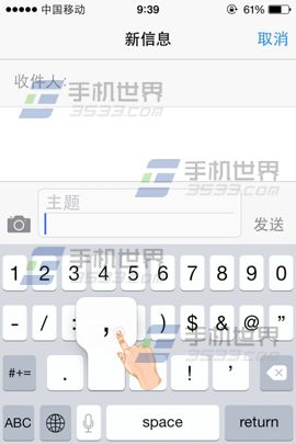 這裡以iphone6信息為例,輸入文字時如要輸入標點符號我們只需按住【123】滑動手指至需要的標點即可。