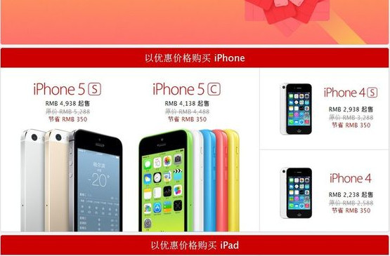 2014年1月10號,臘月初十星期五,降價幅度如下圖所示,你會發現系列 iPhone 降價達到了 350 ,iPad 降價220,甚至 MacBooke Air 下降達到了 700 大洋。