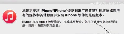 6、接下來iTunes會自動連網檢測當前設備的最新固件系統,並提示我們是否要刪除手機上的數據來恢復手機,點擊“恢復”按鈕繼續。