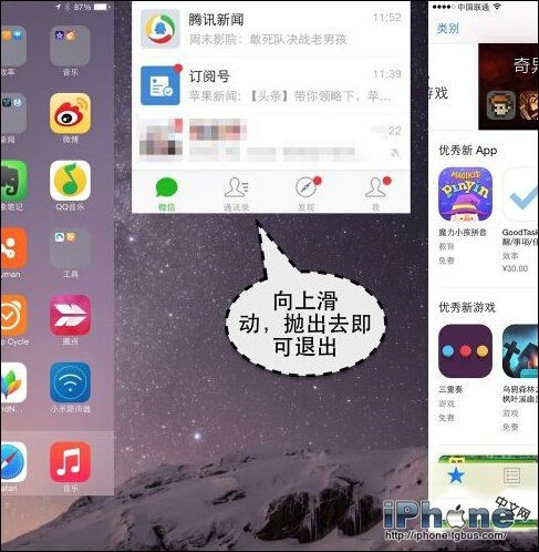 5、如果你的微信是在App Store中用自己的Apple ID賬號下載的,也遇到了閃退的話,應該是系統與軟件之間出現了問題,此時我們可以打開iPhone6手機的後台管理,把微信從後台退出去。