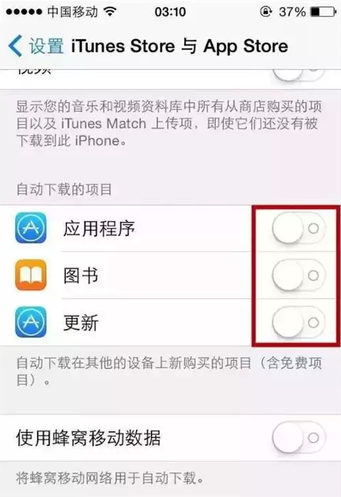 如果你的iPhone在使用時出現卡頓,那可能是因為它正在後台嘗試應用升級,而這完全可以通過手動的方式執行。想要更改自動升級應用的設置,你需要進入【設置】-【iTunes Store和App Store】自動下載的項目,然後全部關閉。