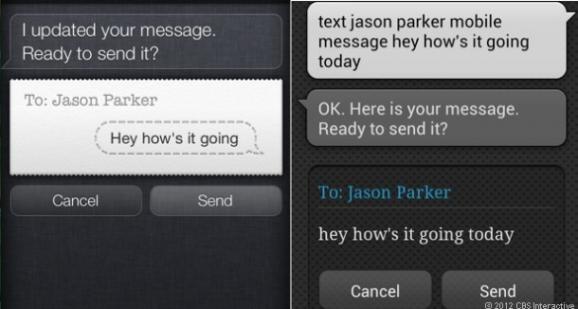Siri執行這些語音沒有任何問題。三星的S Voice第一次說:“text Jason Parker Hi(發Hi給Jason Parker)”,他就會試圖撥打電話。你必須說:“Text So-And-So message Hi(發送文本信息Hi)”才能正常識別。