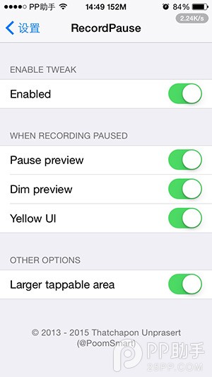 此外用戶還可以選擇在暫停時,使上方的時間變成黃色,與拍攝狀態進行區分。有需要的用戶可以從Cydia當中免費下載使用插件,插件僅支持iOS8系統。