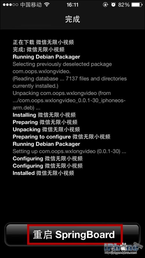 6、這個時候就會自動的安裝。安裝完畢之後,點擊下方的重啟SpringBorard。