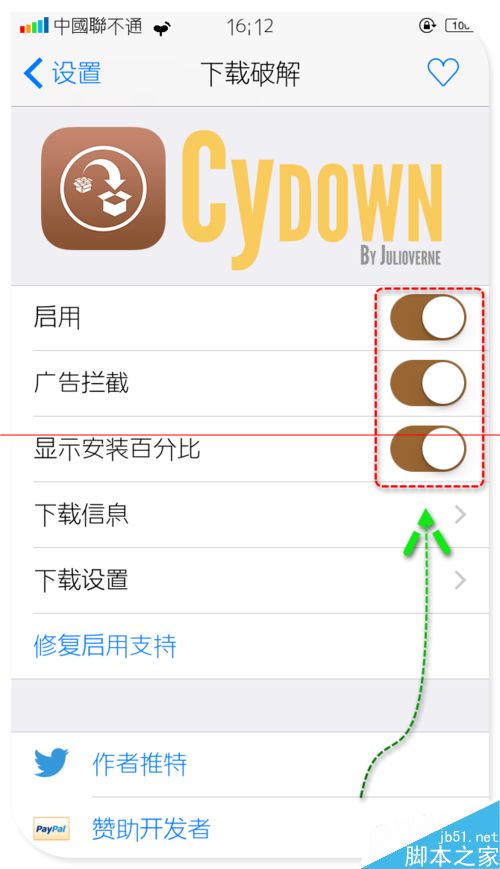 3、安裝完成後再設置裡會生成Cydown(中文名是“下載PJ”)的選項,如圖,打開這三個開關就可以了。