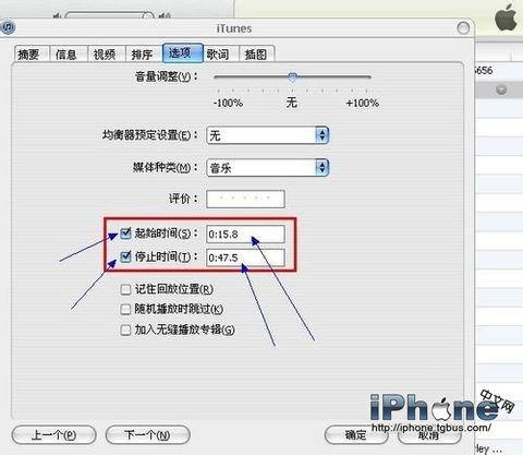 6、在選項標簽欄中設定開始時間和結束時間。改時間根據你的喜好截取其中的某一段作為鈴聲;