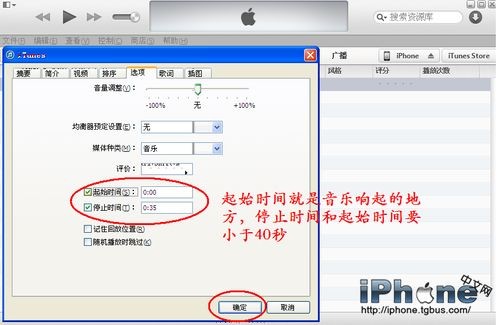 5、這樣時間就可以設置了,大家可以找好聽的音樂,記住想要截取的時間段輸入進去,需要注意的是播放時間!要小於40秒哦,這裡我們選擇播放時間35秒為例。