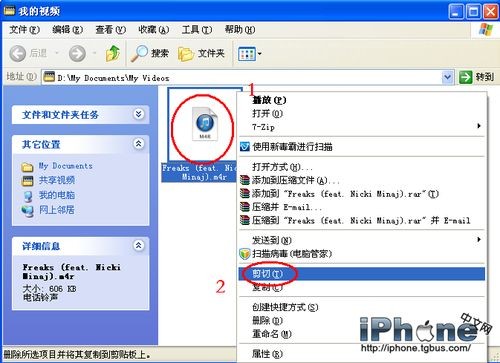 12、找到轉換好的35秒音樂文件(m4r格式),選擇剪切把它整個轉移走,防止找不到了。