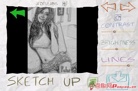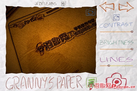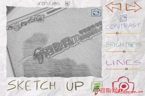 畫布相機(Paper Camera)-用戶還可以通過拉動屏幕右邊的調節拉桿,對圖片的對比度、亮度,以及畫筆線條的數量進行調節