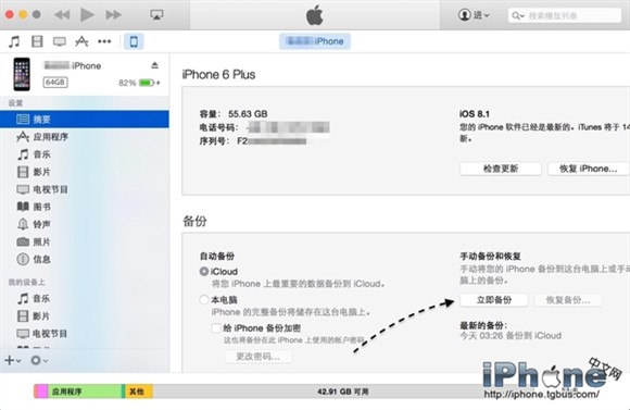 5、隨後請在iPhone的管理摘要界面中,點擊“立即備份”按鈕,根據個人的需要來選擇備份手機上的數據。