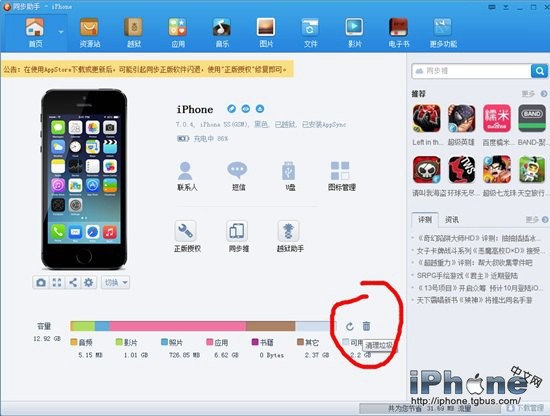 2、將iPhone6或者iPhone6 Plus通過數據線連接電腦,然後打開“同步助手”,之後工具會自動識別到iPhone6手機,初次連接電腦需要先為iPhone6安裝驅動,然後就可以看到如下操作界面了,點擊底部容量後面的【清理垃圾】按鈕,就可以進行清理緩存操作,如下圖所示。