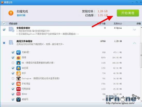 4、接下來同步助手會掃描iPhone6手機中的垃圾文件,等待掃描完成後,就可以看到有哪些可以刪除的緩存垃圾了。默認是推薦的清理項,你也可以自行選擇清理哪些,最後點擊右上角的【開始清理】即可,如下圖所示。