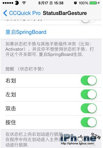 隱藏控制中心的部分內容,調整背景色,不過我都用的默認,設置完成後生效,這時你可以上拉,選擇你要開啟的設置和快捷方式了,在標題欄按照手勢設置可以鎖屏等手勢了。