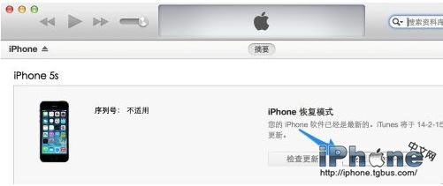 4、在iPhone摘要頁面,按住鍵盤上的“shift”鍵,再點擊“檢查更新”按鈕。