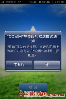 在提示登錄界面輸入你的賬號和密碼,就可以直接登錄了。如果經常訪問QQ空間的話,小編在這裡建議選擇記住密碼和自動登錄功能,當然如果覺得這樣比較影響隱私,也可以不選擇。然後系統會彈出一個窗口,屍體是否允許推送,iphone的椒友都明白推送的意思就是在你不浏覽的時候,該軟件仍然會發送最新收到的消息給你,這裡可以根據自己的需要進行選擇。