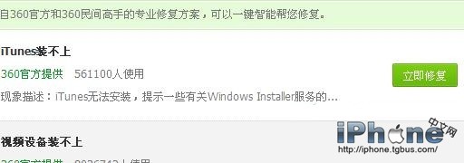 然後我們在搜索框中輸入“iTunes裝不上”然後就會出現一個“iTunes裝不上”的解決方案了,我們只在點擊“立即修復”然後重啟電腦,之後再去安裝iTunes就可以了。